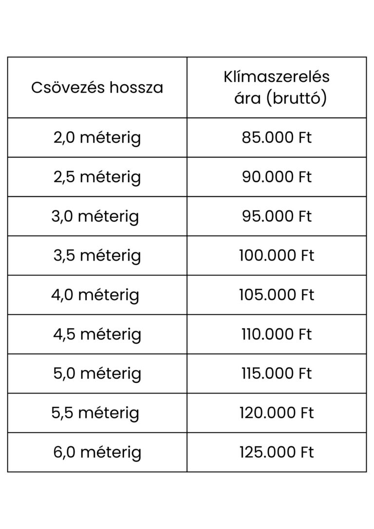 Azért választottuk ezt az értéket, mert a szerelések nagy része ezen a távolságon belül megoldható. Így Önnek sem kell a centiket számolgatnia, és mi sem vesszük figyelembe, ha esetleg néhány centivel hosszabb csövezésre van szükség. Az ennél hosszabb csövezési szakaszokra egyedi árat fogunk megadni az árajánlatban, amelyet a felmérés után kap majd. Normál szerelési esetekben 10.000 Ft/méter árat számítunk fel a 2 méteres távolságon felüli csövezésre.